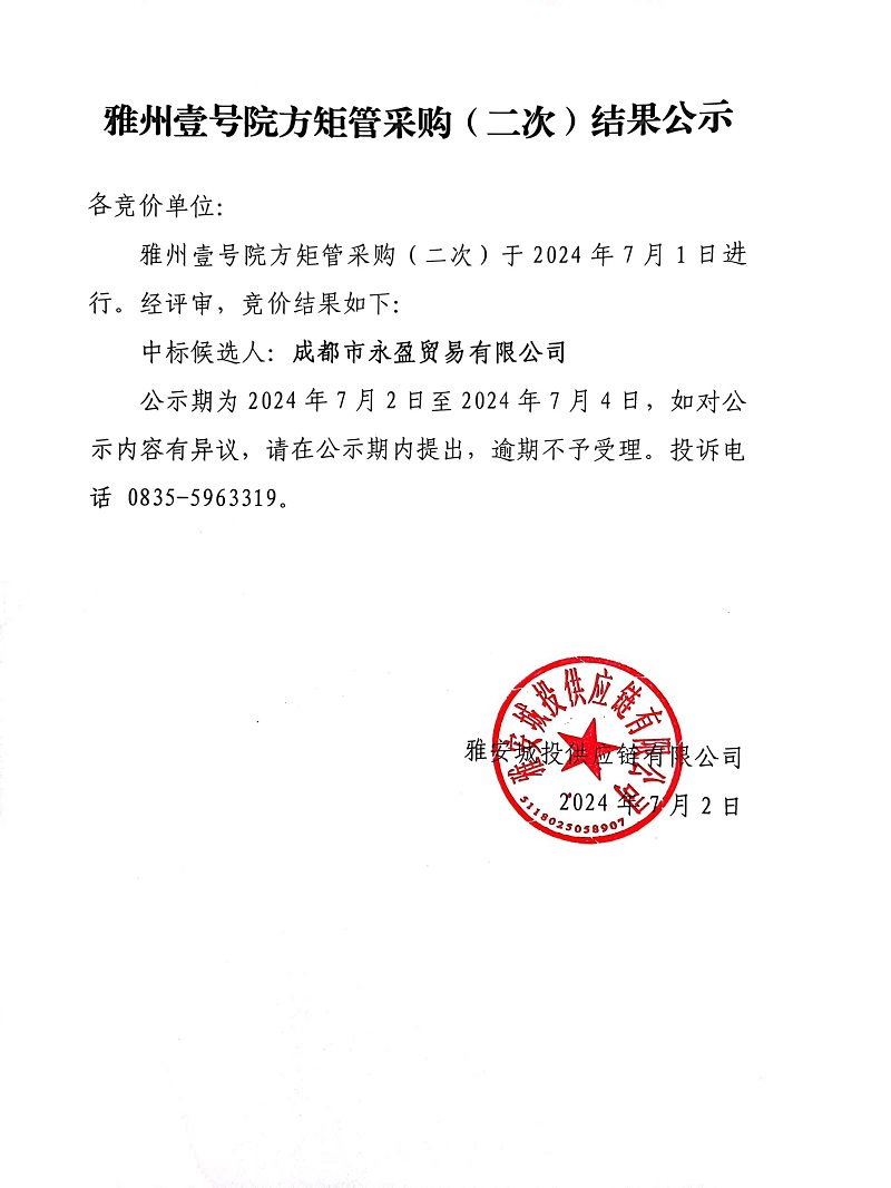 雅州壹號(hào)院方矩管采購(gòu)(二次)結(jié)果公示