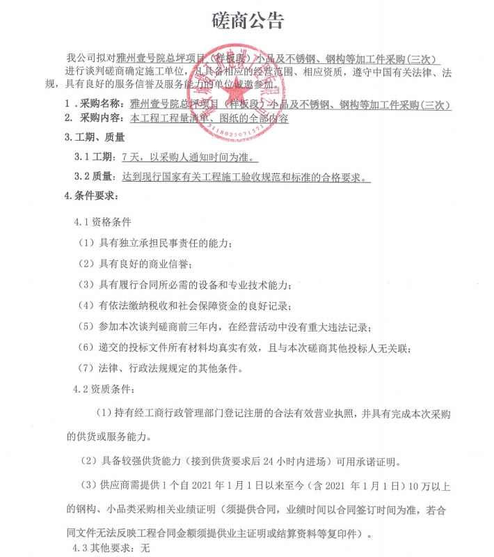 雅州壹號院總坪項目(樣板段)小品及不銹鋼、鋼構(gòu)等加工件的采購(三次)磋商公告