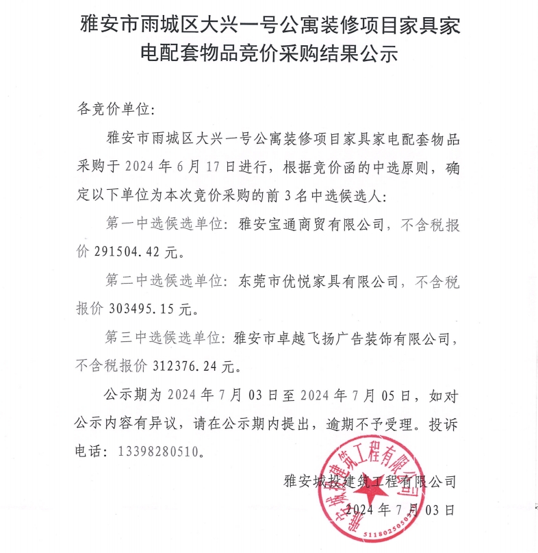 雅安市雨城區(qū)大興一號公寓裝修項目家具家電配套物品競價采購結(jié)果公示