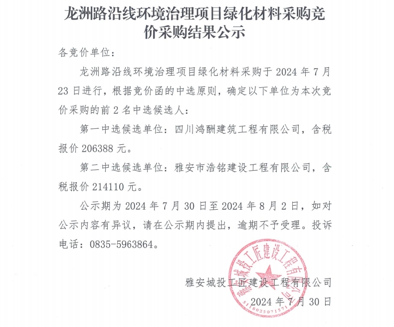 龍洲路沿線環(huán)境治理項目綠化材料采購競價采購結(jié)果公示