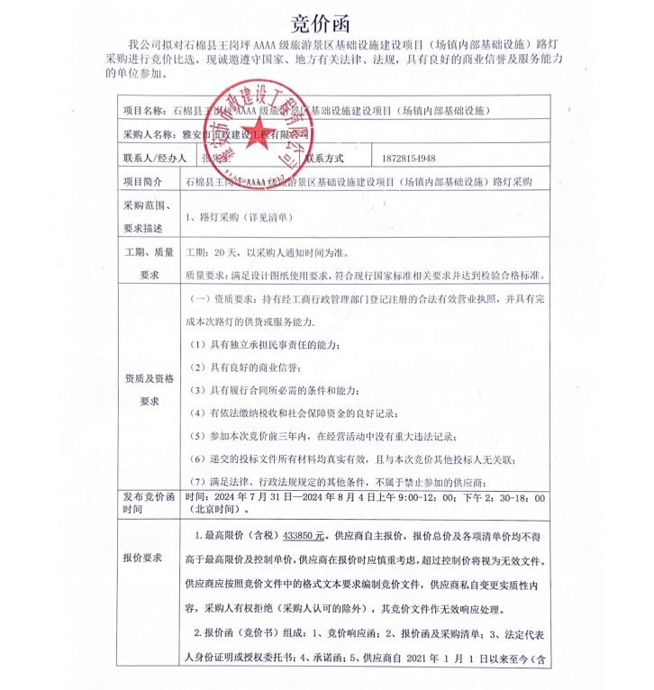 石棉縣王崗坪AAAA級(jí)旅游景區(qū)基礎(chǔ)設(shè)施建設(shè)項(xiàng)目(場(chǎng)鎮(zhèn)內(nèi)部基礎(chǔ)設(shè)施)路燈采購(gòu)競(jìng)價(jià)公告