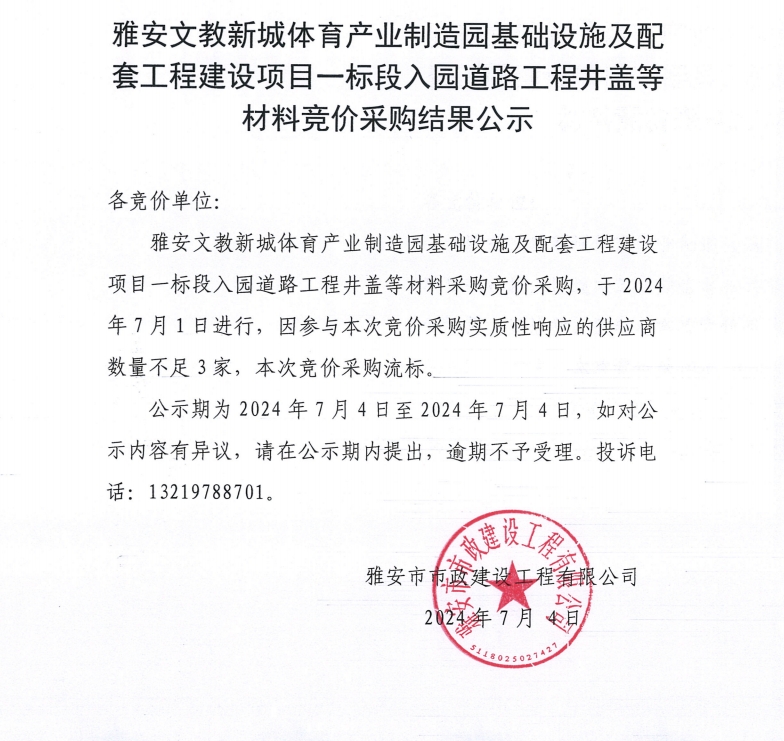 雅安文教新城體育產(chǎn)業(yè)制造園基礎(chǔ)設(shè)施及配套工程建設(shè)項(xiàng)目一標(biāo)段入園道路工程井蓋等材料競價采購結(jié)果公示