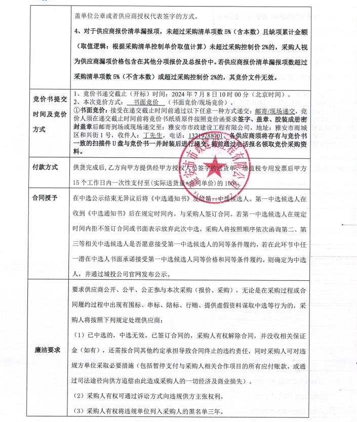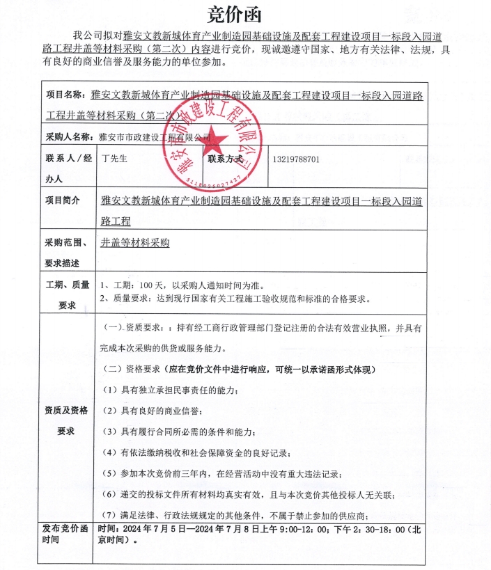 雅安文教新城體育產業(yè)制造園基礎設施及配套工程建設項目一標段入園道路工程井蓋等材料采購(第二次)競價公告