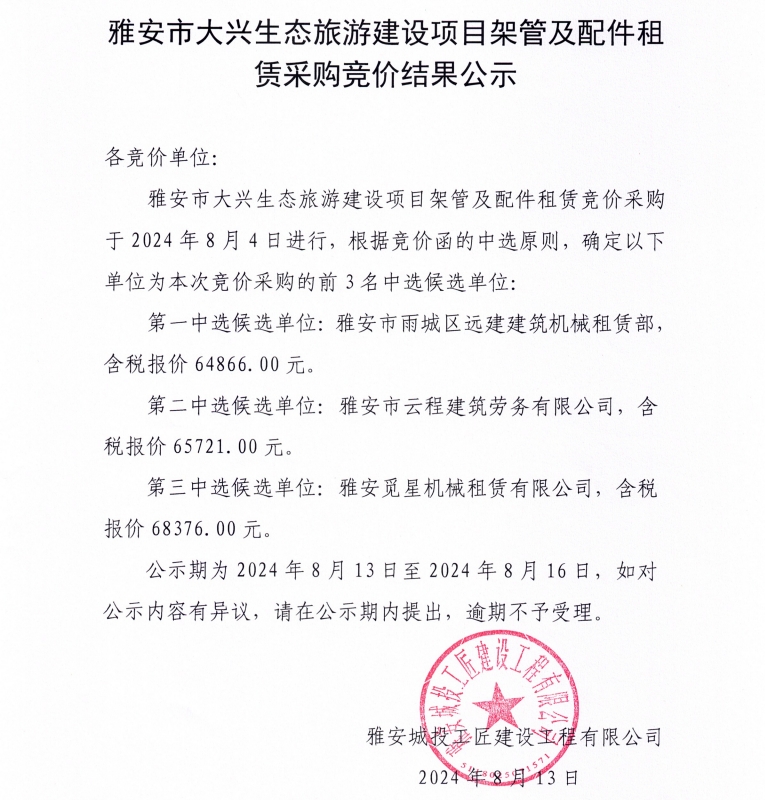雅安市大興生態(tài)旅游建設(shè)項(xiàng)目架管及配件租賃采購競價(jià)結(jié)果公示