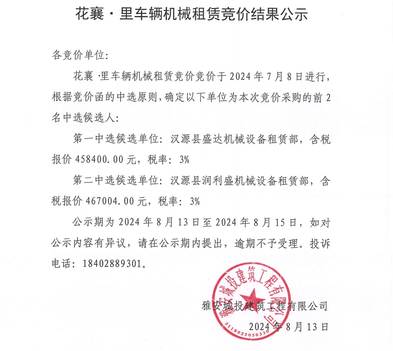 花襄·里項(xiàng)目車(chē)輛機(jī)械租賃競(jìng)價(jià)結(jié)果公示