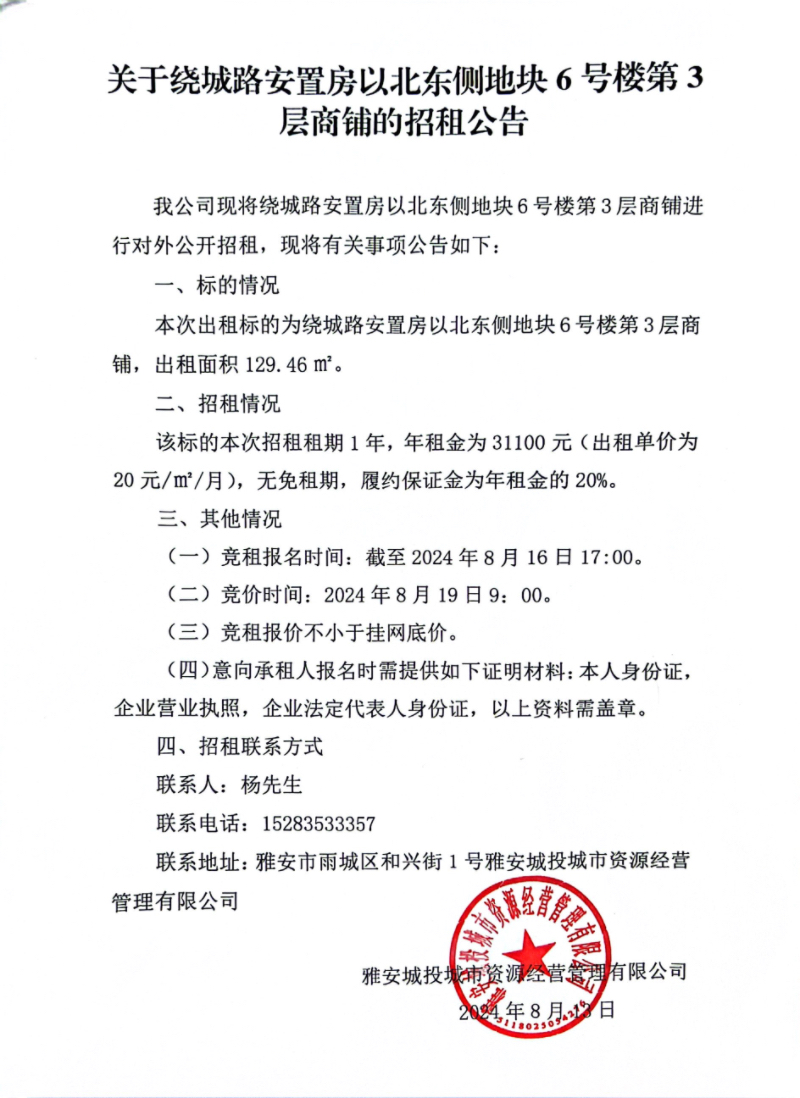 關于繞城路安置房以北東側(cè)地塊6號樓第3層商鋪的招租公告