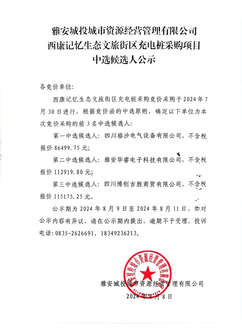 雅安城投城市資源經(jīng)營(yíng)管理有限公司西康記憶生態(tài)文旅街區(qū)充電樁采購(gòu)項(xiàng)目中選候選人公示