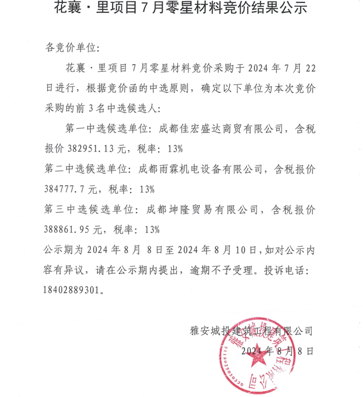 花襄·里項目7月零星材料競價結果公示