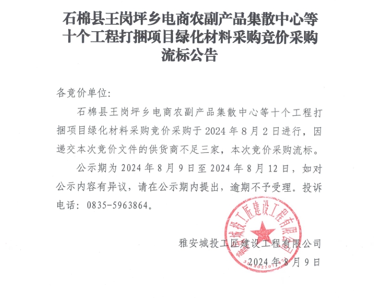 石棉縣王崗坪鄉(xiāng)電商農(nóng)副產(chǎn)品集散中心等十個(gè)工程打捆項(xiàng)目綠化材料采購(gòu)競(jìng)價(jià)采購(gòu)流標(biāo)公告