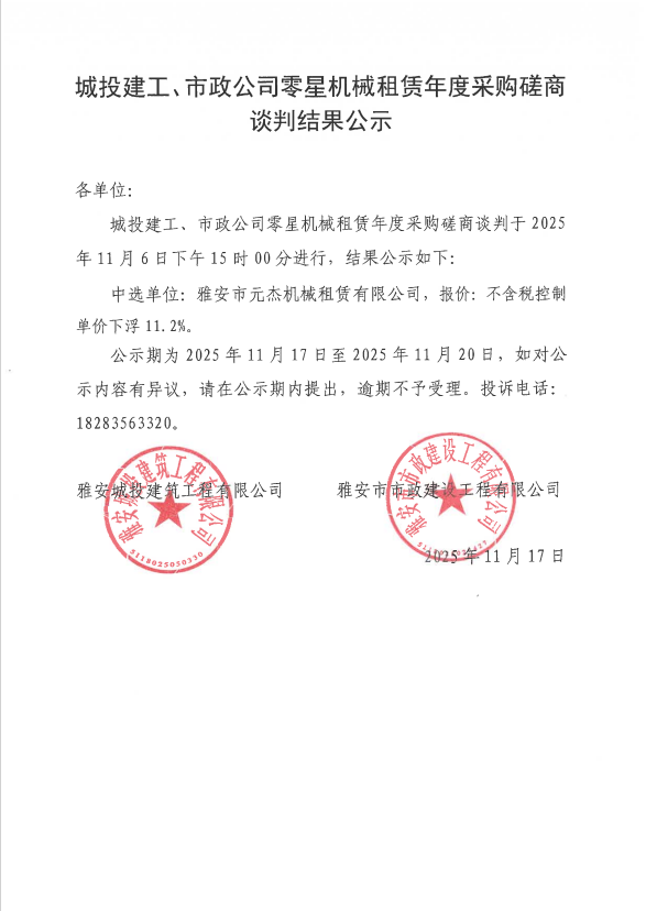 城投建工、市政公司零星機械租賃年度采購磋商談判結(jié)果公示