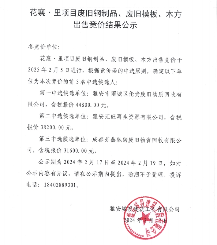 花襄·里項(xiàng)目廢舊鋼制品、廢舊模版、木方出售競(jìng)價(jià)結(jié)果公示