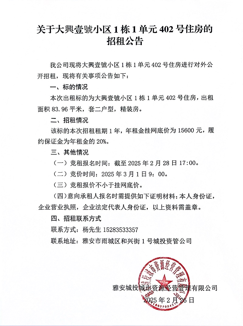 關(guān)于大興壹號(hào)小區(qū)1棟1單元402號(hào)住房的招租公告