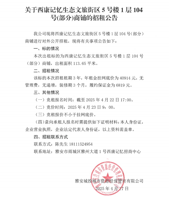關于西康記憶生態(tài)文旅街區(qū)5號樓1層104號(部分)商鋪的招租公告