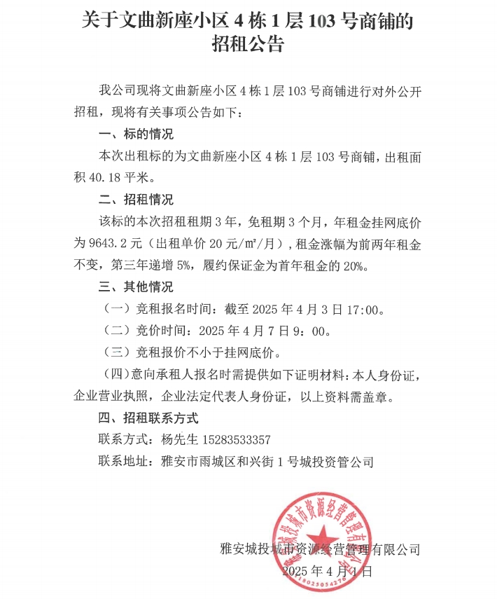 關(guān)于文曲新座小區(qū)4棟1層103號(hào)商鋪的招租公告