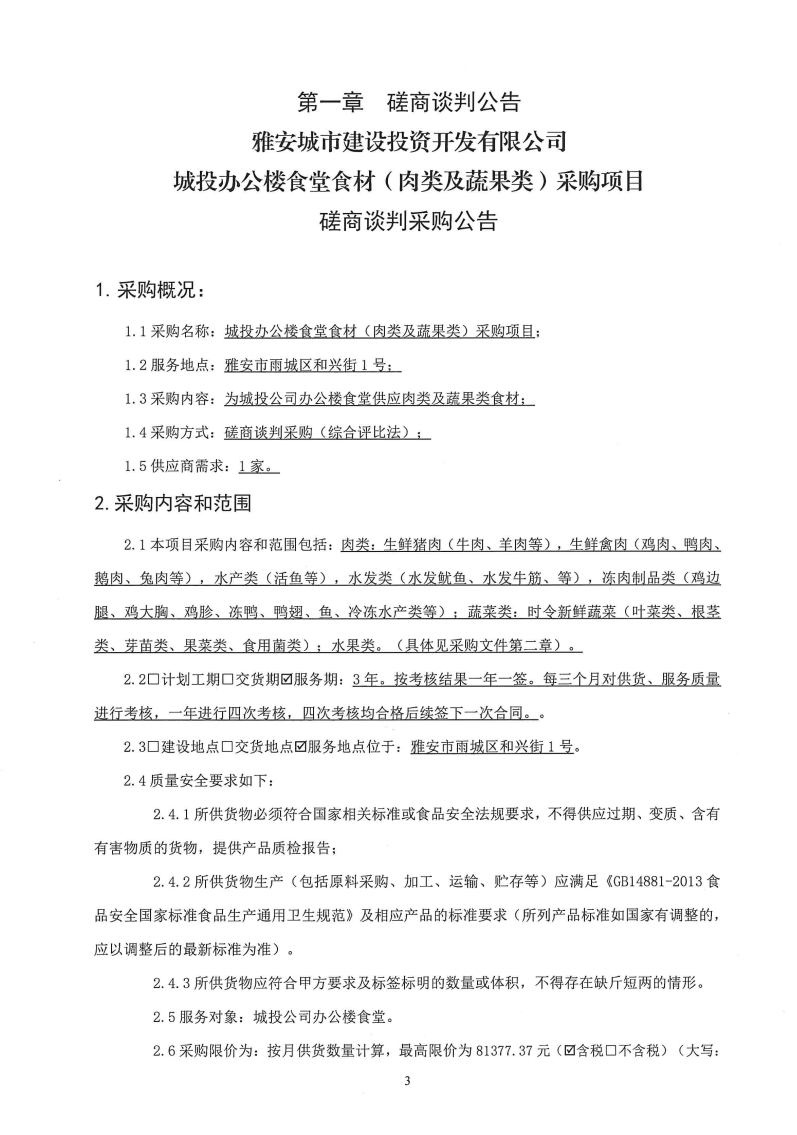 雅安城市建設(shè)投資開發(fā)有限公司城投辦公樓食堂食材(肉類及蔬果類)采購項目磋商談判采購公告