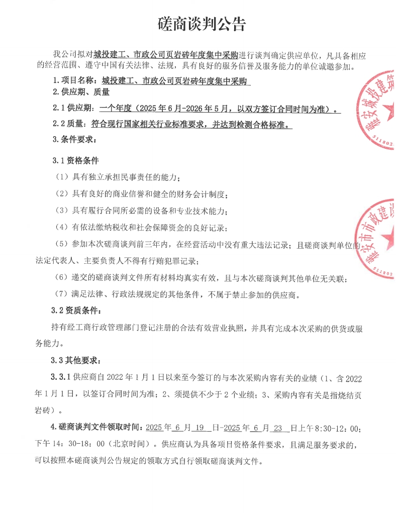 城投建工、市政公司頁巖磚年度集中采購磋商談判公告