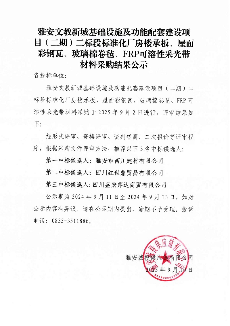 雅安文教新城基礎(chǔ)設(shè)施及功能配套建設(shè)項(xiàng)目(二期)二標(biāo)段標(biāo)準(zhǔn)化廠房樓承板、屋面彩鋼瓦、玻璃棉卷氈、FRP可溶性采光帶材料采購(gòu)結(jié)果公示