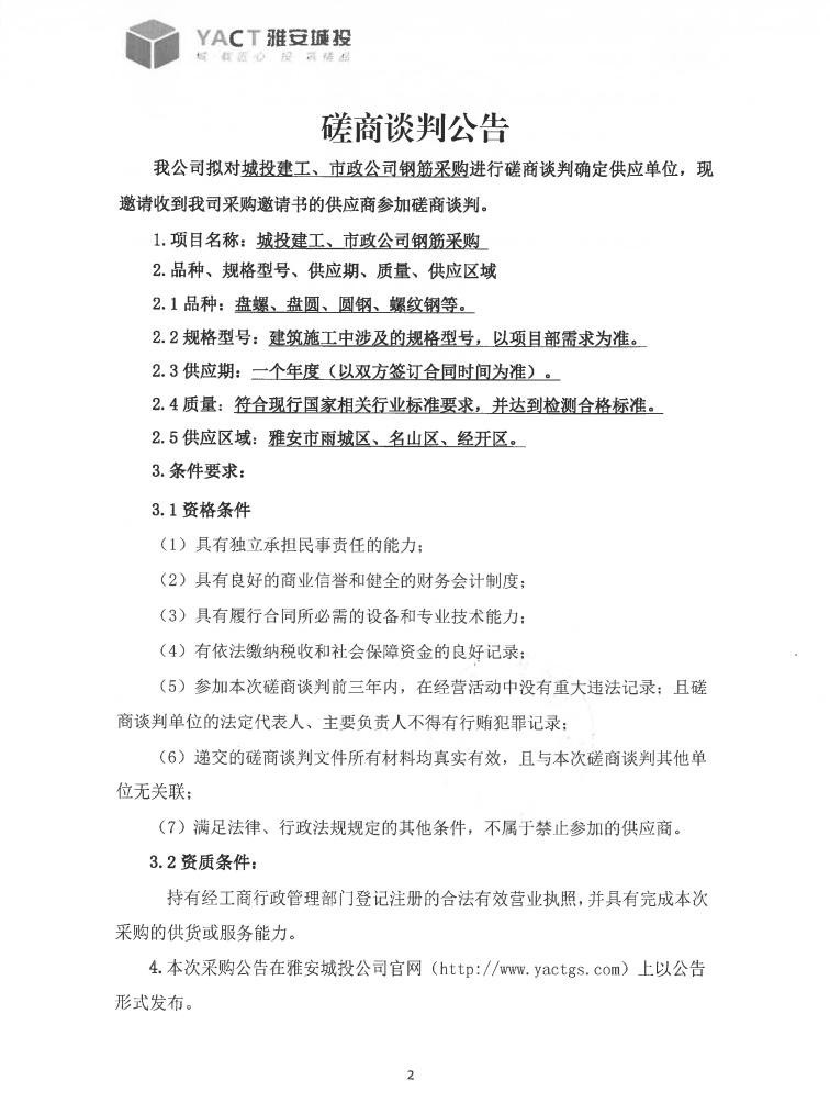 城投建工、市政公司鋼筋采購(gòu)磋商談判公告