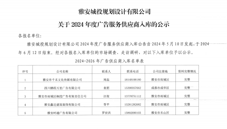 雅安城投規(guī)劃設(shè)計(jì)有限公司關(guān)于2024年度廣告服務(wù)供應(yīng)商入庫(kù)的公示