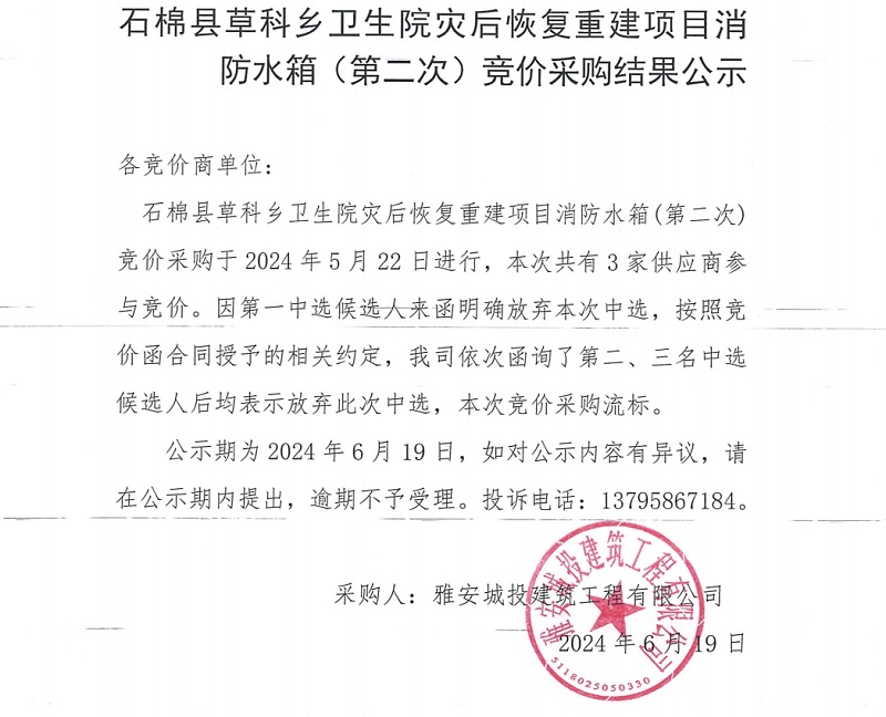 石棉縣草科鄉(xiāng)衛(wèi)生院災后恢復重建項目消防水箱(第二次)競價采購結(jié)果公示